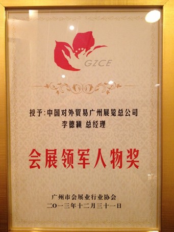 2014年2月28日,中國(guó)對(duì)外貿(mào)易展覽總公司總經(jīng)理李德穎獲廣州市會(huì)展行業(yè)協(xié)會(huì)頒授“會(huì)展領(lǐng)軍人物獎(jiǎng)”,以表彰他在2013年度為廣州市會(huì)展行業(yè)的發(fā)展所作的突出貢獻(xiàn)。頒獎(jiǎng)儀式在云來斯堡酒店舉行,同日還舉行了廣州市會(huì)展業(yè)行業(yè)協(xié)會(huì)第二屆六次理事會(huì)、第七屆穗港澳會(huì)展合作論壇暨城市會(huì)展合作交流會(huì),以及廣州市會(huì)展行業(yè)協(xié)會(huì)2014年新春聯(lián)誼會(huì)。