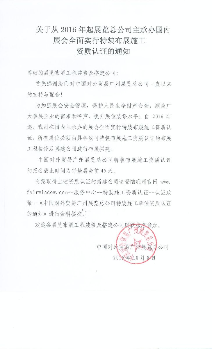 關(guān)于從2016年起展覽總公司主承辦國內(nèi)展會全面實行特裝布展施工資質(zhì)認(rèn)證的通知